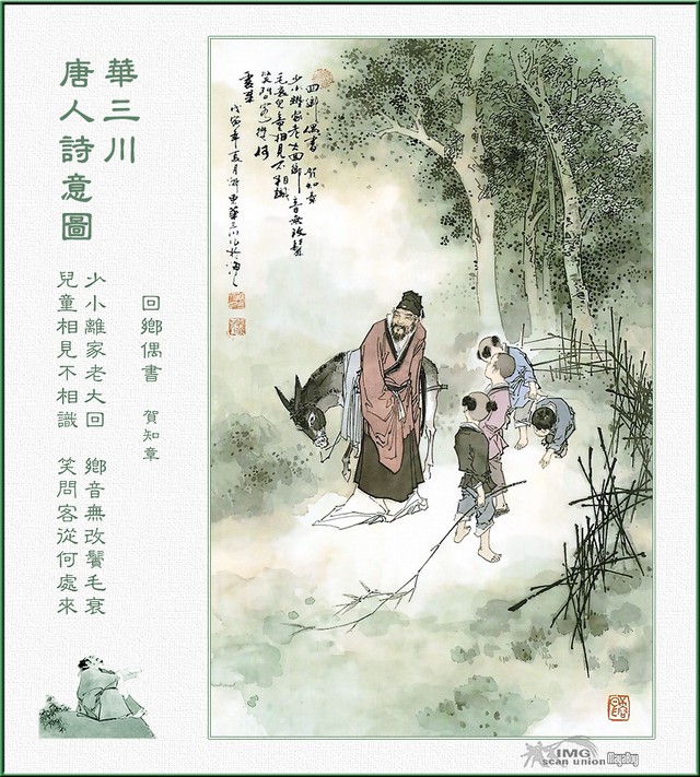 回乡偶书——贺知章 少小离家老大回,乡音无改鬓毛催。 儿童相见不相识,笑问客从何处来。